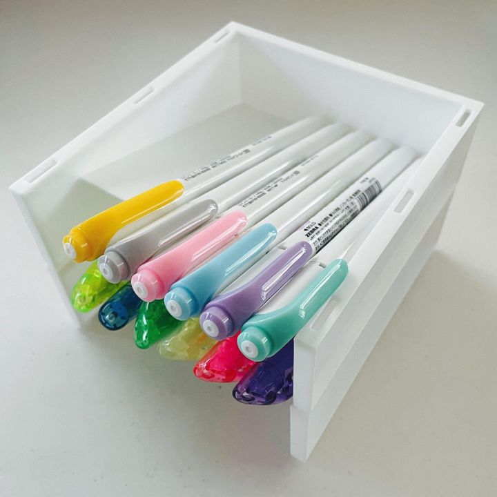 普通のペン立てでは容量も足りずペン立てをいくつも並べて収納しているのですが、上から見ないと欲しい色が探せず不便そうでした。