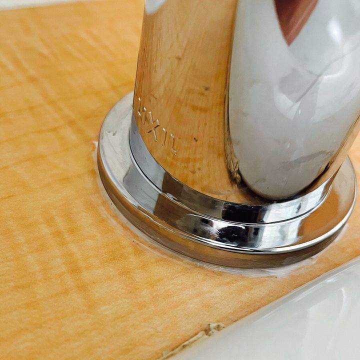 本来ならマスキングテープなどではみ出し防止をしてから塗るのが良いようですが、蛇口の根本は円柱形な上にマスキングテープを貼ることが難しかったので、チューブから補修剤を出して蛇口の根本にぐるっと1周させた後、ビニール手袋を装着して余った補修剤を指で取りながら隙間に入れ込んでみました。