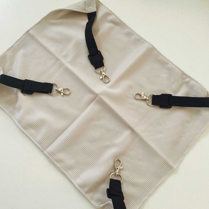 商品サイズは40×30cm。四隅にナスカンが付いたアジャスターが縫い付けられているので引っ掛けるだけの簡単取り付けです。