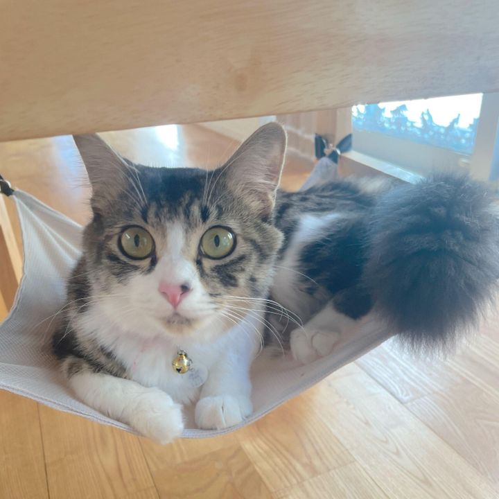猫を抱きかかえてハンモックに乗せたところ、初めは匂いを確かめつつ少しオドオドしていましたが、しばらく乗っていてくれましたよ!
