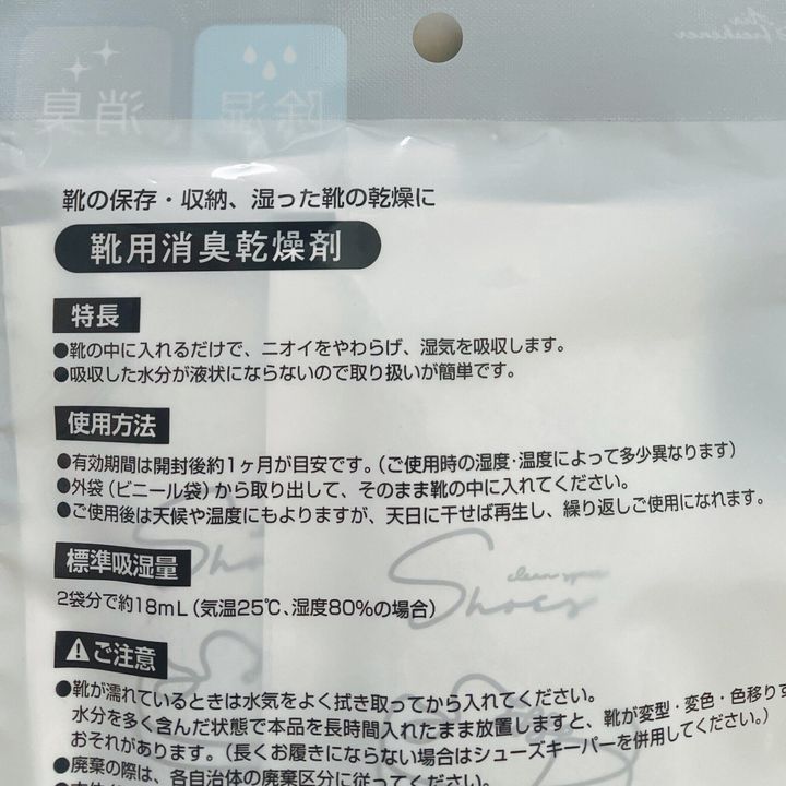 ・水分を多く含んだまま乾燥剤を入れっぱなしにすると靴が変形・変色・色移りする可能性があること