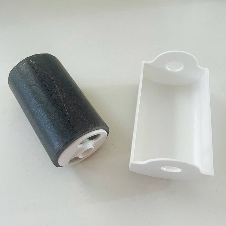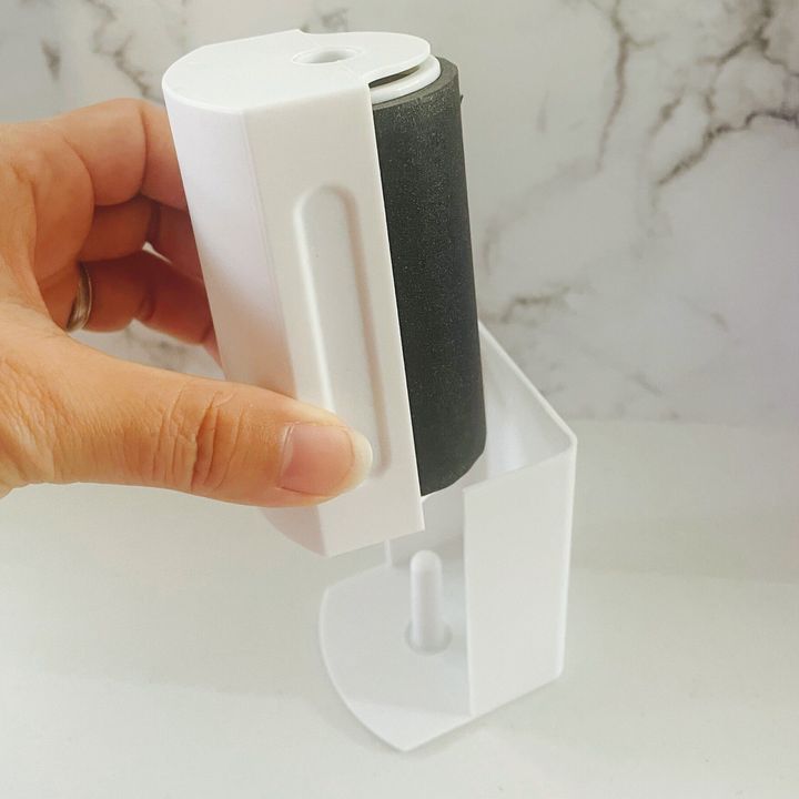 別途準備したコロコロ用の粘着テープの両端の穴にパーツを取り付けてホワイトパーツに両端の突起が入るようにセットすればコロコロ部分の完成!