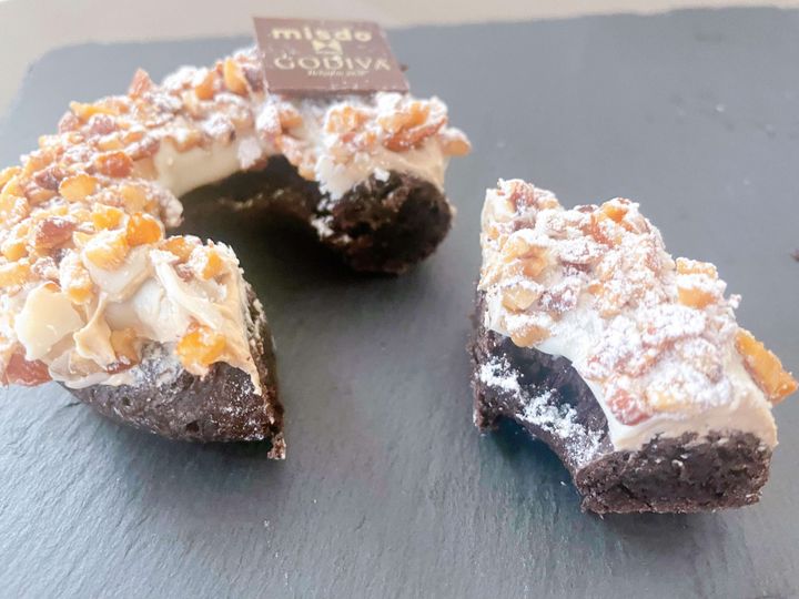 こちらも”プレミアムショコラドーナツ生地”が使われており、プラリネホイップを絞り、ホワイトチョコでコーティングしているんですよ。