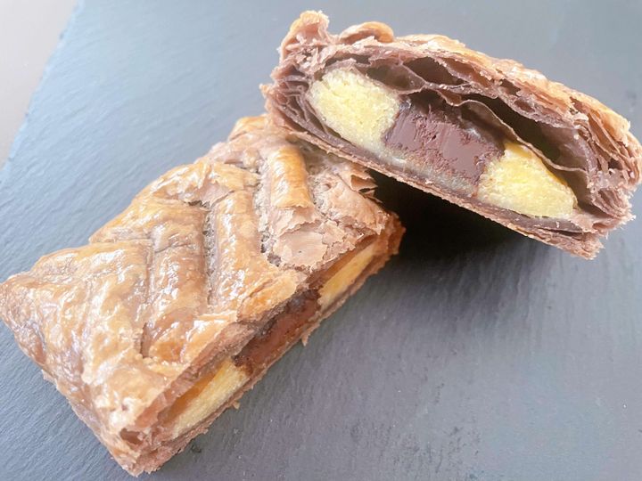 プレミアムショコラパイ生地に、カスタードクリームとアーモンドクリームを合わせ、チョコレートを中に入れて焼き上げた一品。