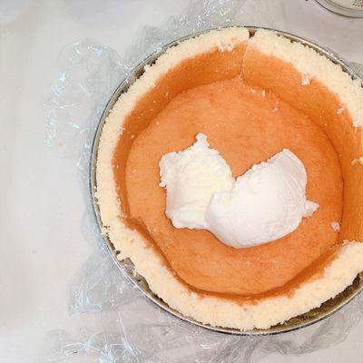 2枚目の底に合わせてカットしたスポンジを少し周りをカットしてアイスの上に重ね、さらにアイスを重ねます。