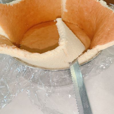 余ったスポンジをケーキ型の側面に合わせ、カットしていきます。