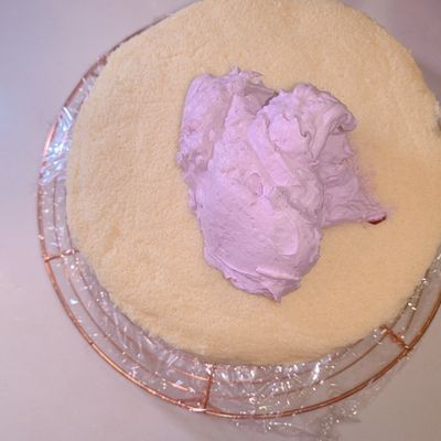 冷凍庫に保存してあったケーキの台を出し、淡い紫色クリームを全体に塗っていきます。