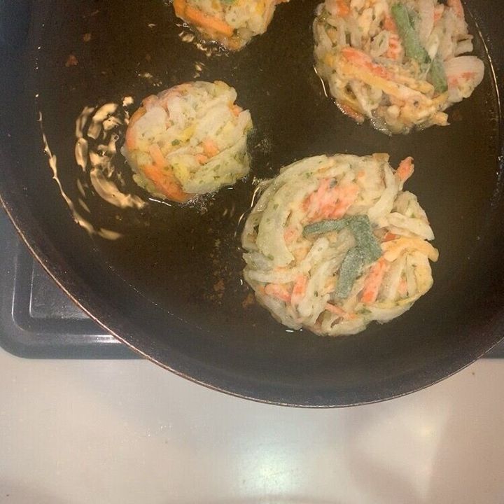 かき揚げって数種類の野菜を千切りにして、揚げる手間が掛かります。