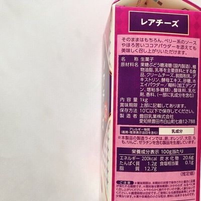 原材料名:果糖ぶどう糖液糖(国内製造)、植物油脂、乳糖を主要原料とする食品、クリームチーズ、脱脂粉乳、デキストリン、酵母エキス、砂糖、ホエイパウダー/糊料(加工デンプン、増粘多糖類)、酸味料、乳化剤、香料(一部に乳成分を含む )