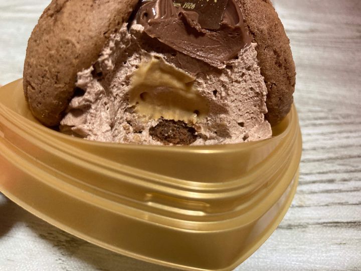 上部のガナッシュクリームはかためでほろ苦、チョコクリームもなめらかですが甘さ控えめでほんのり苦みもあります。