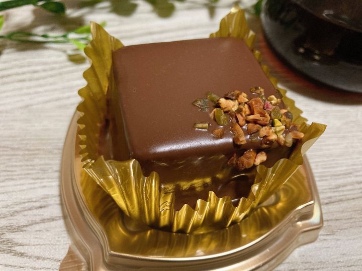 四角く表面にはツヤのあるケーキにピスタチオがトッピングされており、高級感のある見た目。