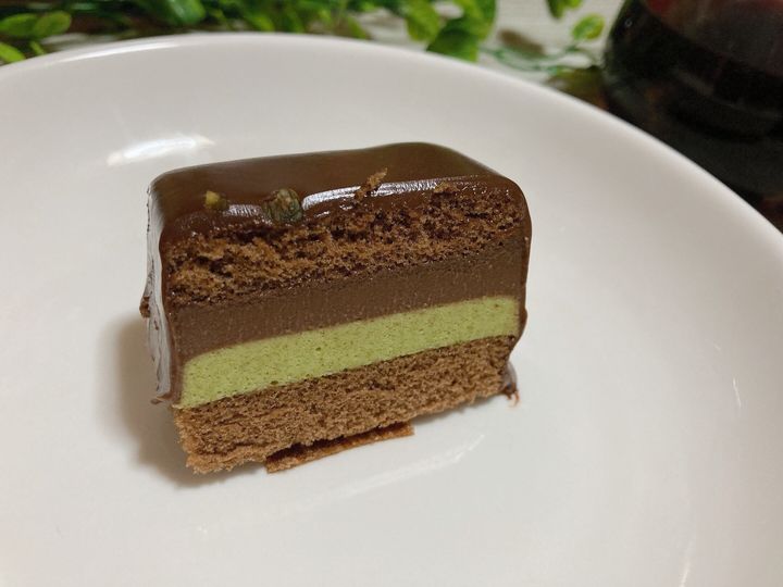ココアスポンジ、ピスタチオチョコソース、ピスタチオチョコムース、ココアスポンジと層になっていました。