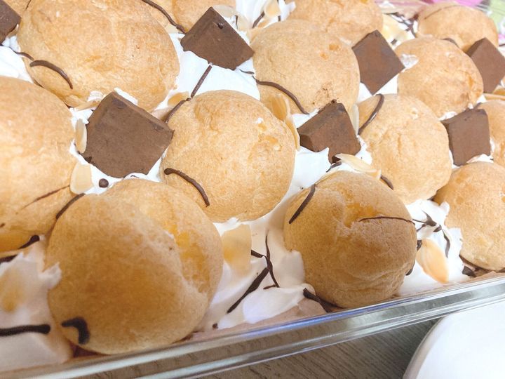 昨年は、チョコムースの上にミニシュークリーム、チョコソース、アーモンドスライスのトッピングでした。