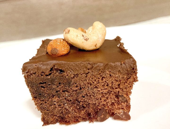 切り分けるまで分かりませんでしたが、表面のナッツトッピングの下は、チョコレートがかけられていて、その下にブラウニー、生地の下の方にはチョコチップがぎっちりと入っていました。