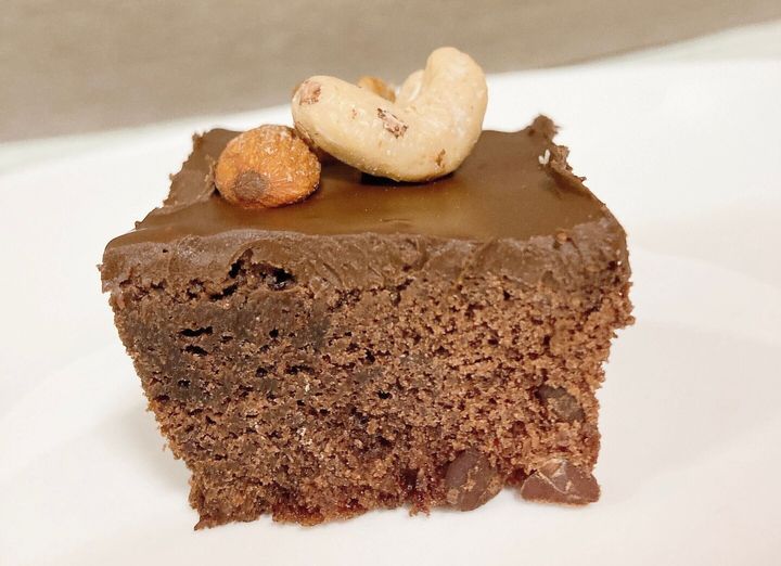 小さめにカットし食べてみると、表面のチョコはやわらかく、ブラウニーはかためで濃厚な甘さ、トッピングのナッツとチョコチップの食感が楽しいスイーツ。