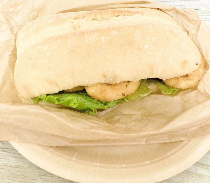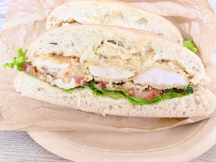 ボリュームのあるサンドイッチの新作はチキン!ずっしりと重くシェアにもおすすめのサイズです。