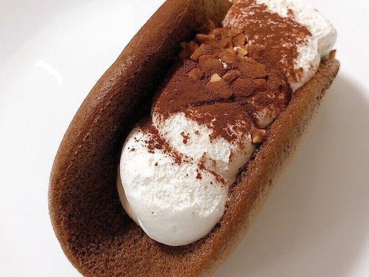 ふわふわのオムレット生地に、ホイップクリームとチョコクリームのダブルクリームが挟まれています。クリームの中には、こっそり生チョコが隠れています。トッピングにはローストしたアーモンドがちりばめられ、その上をココアパウダーが覆っています。