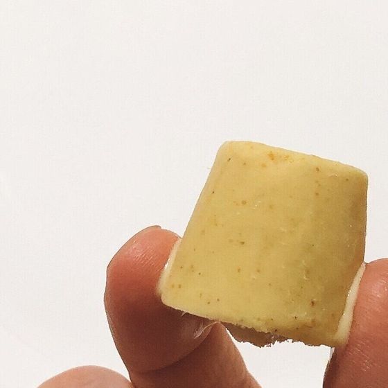 スパイスカレー味は、ひとくちサイズながら、カレー色の中にスパイスの粉が練りこまれている様子がみえました。ラッシー味はヨーグルトのような乳白色を呈しています。