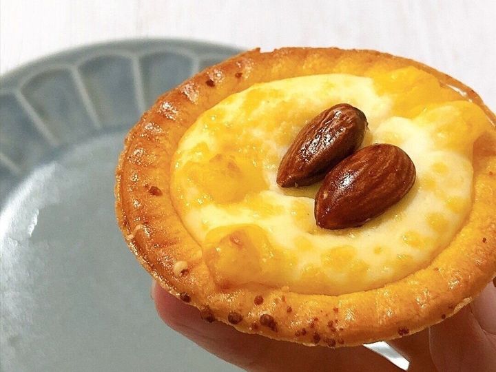 手のひらサイズの円形タルト生地の中には、3種類のチーズを使用したチーズフィリングが入っています。チーズフィリングには、デンマーク産クリームチーズをベースに、ゴーダチーズとカマンベールを使用しています。天面にはパルメザンチーズとアーモンドがのっています。
