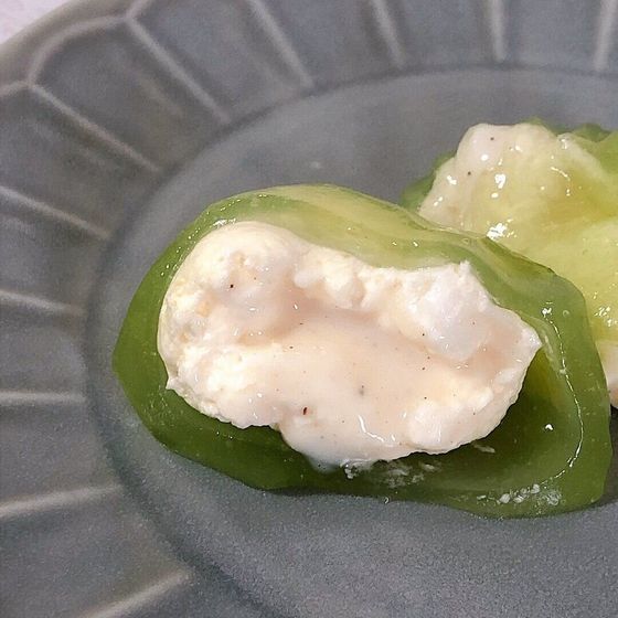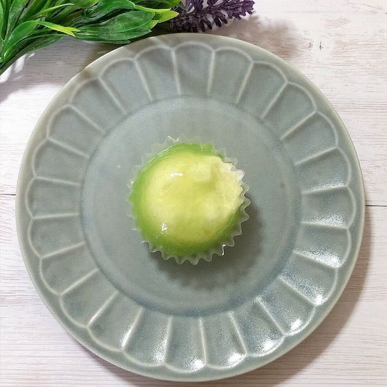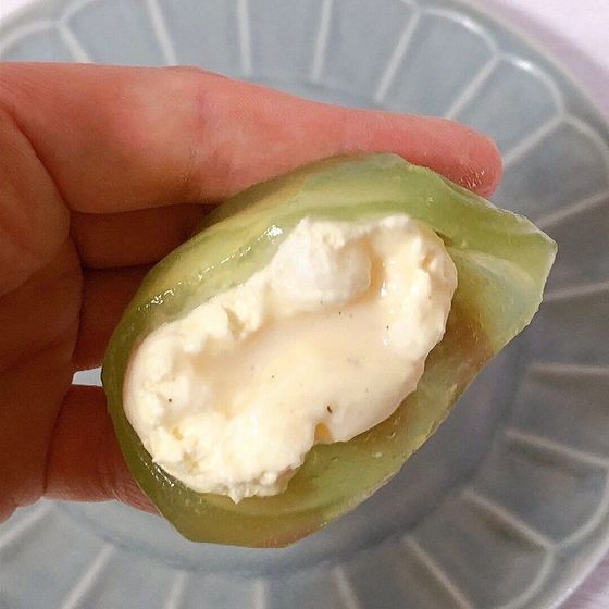透き通った鮮やかなメロン色で、てかてかと光沢のあるわらび餅皮。パッケージを開けると、メロンソーダの香りが広がり、夏らしい気分が高まります。