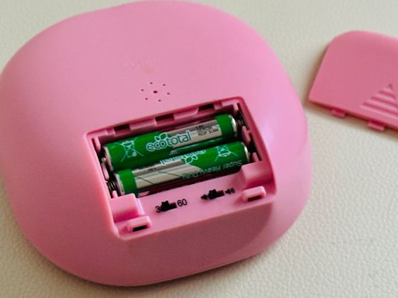 アラームは3秒と60秒、音量は大小2パターン選択可能です。我が家では電池式(単4電池2本)を購入しましたが、充電式も発売されています。