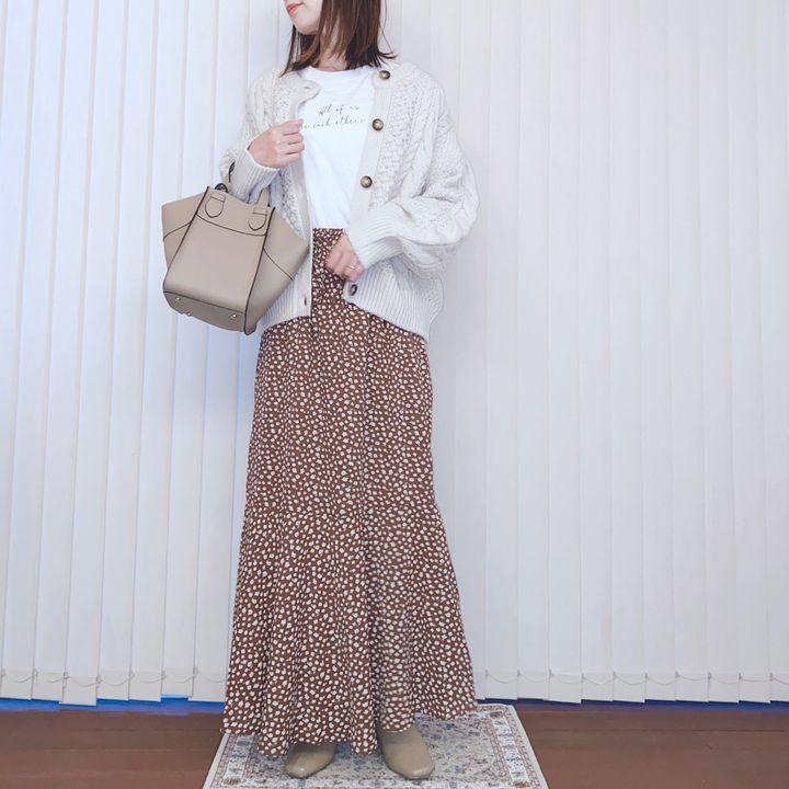 花柄スカートと合わせるとナチュラルガーリーな印象に。淡色女子コーデの完成です。