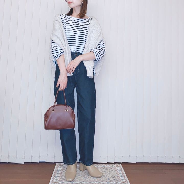 最後は肩掛けスタイル。定番のボーダーTとデニムコーデに足すだけでこなれた印象に。袖のケーブルがアクセントになっていてオシャレに見えます。靴やバッグもカジュアル過ぎないものにするのがポイントです。
