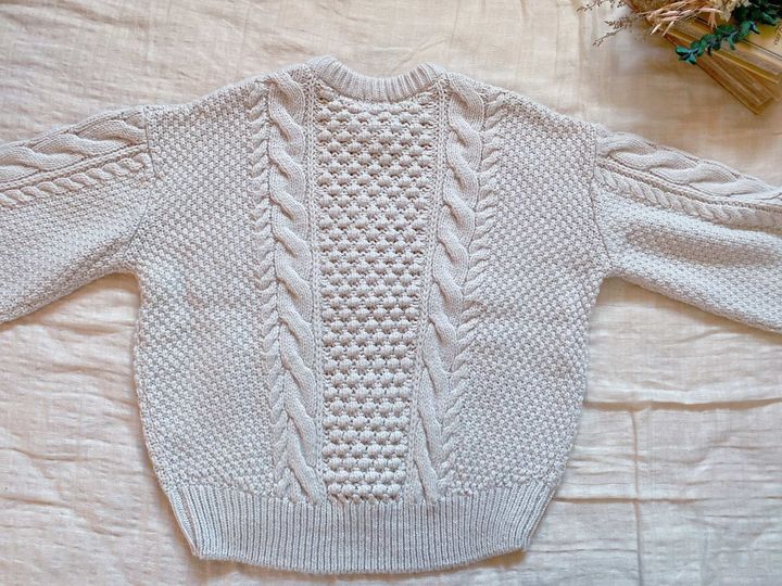 今年のデザインは、立体的なケーブル編みとポコポコとしたポップコーン柄がとっても可愛くて高見えしています。また、丸みを帯びたコクーンシルエットはそのままに、今年はドロップショルダーとボリュームスリーブを加えてよりトレンドなデザインにアップデートされています。