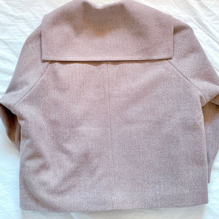 襟が可愛らしい印象ですが、シングルボタンやラグランスリーブで全体的にシンプルなデザインに仕上げてくれているので、大人でも十分着られるコートです。
