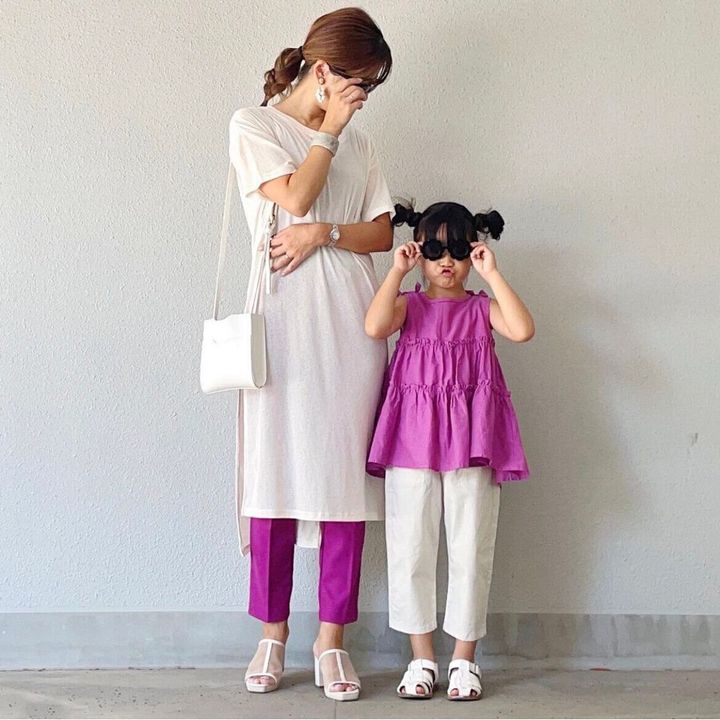 この場合、娘のワンピースに使われてる色から、同じようなパープルを抜粋して、私はパープルのカラーパンツを選びました。