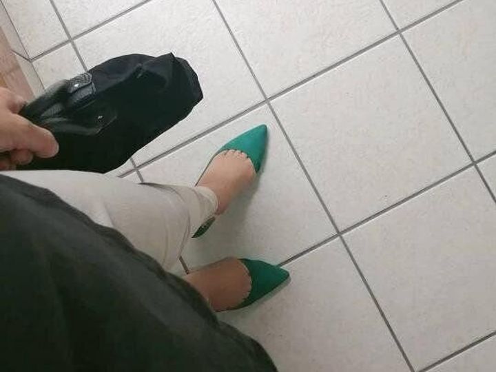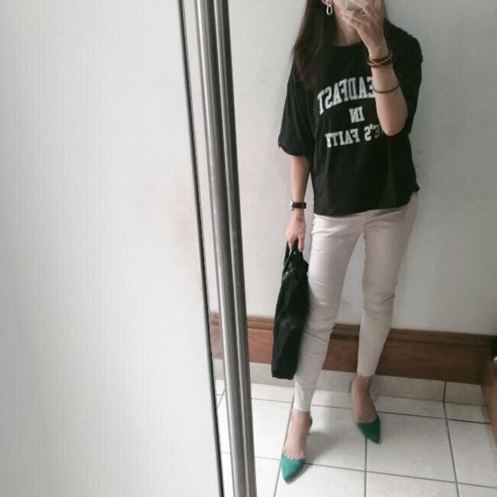 地味にならないように、トレンドのグリーンをパンプスで取り入れてみました。