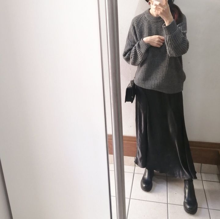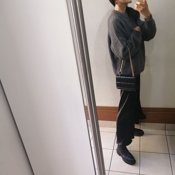 ニットに加えて、ボリュームのあるチェルシーブーツでカジュアルダウンさせました。