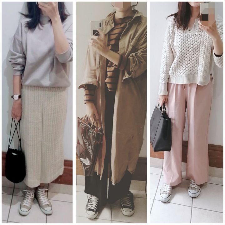 秋のニットスカートやワイドパンツなど重めシルエットの服装でもしっかりと受け止めてくれるコンバースハイカットスニーカーは毎年大活躍。