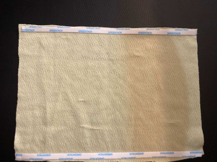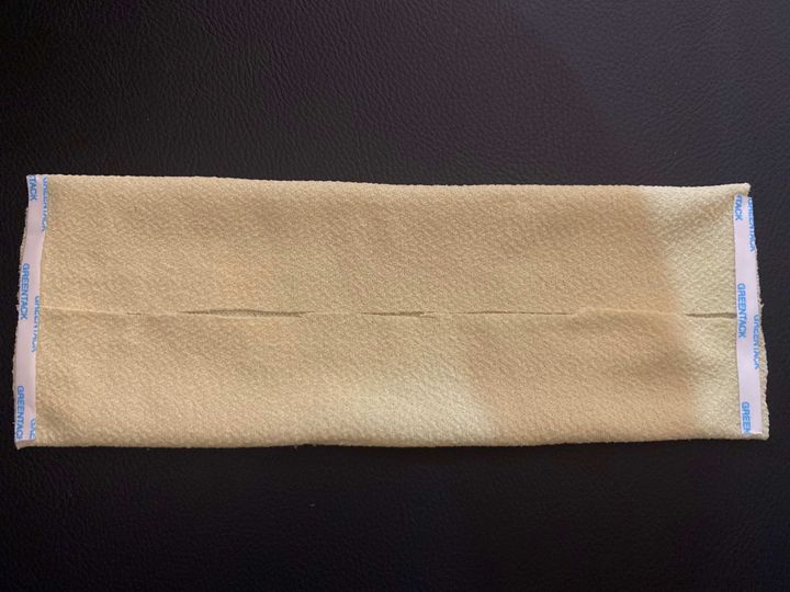 2.布の長い部分が横になるように置き、上下の端に両面テープを貼り付けます。