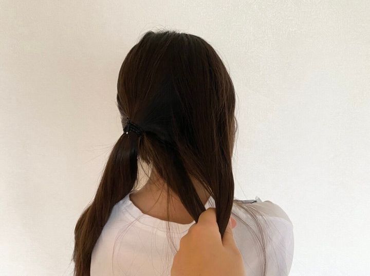 2.左側の束と右から3番目の毛束をゴムで結びます。