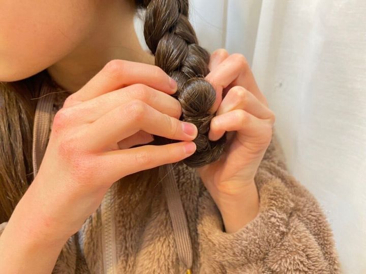 3.毛先を引っ張り形を整えればしっかりと三つ編みヘアがゴムなしでも完成します!