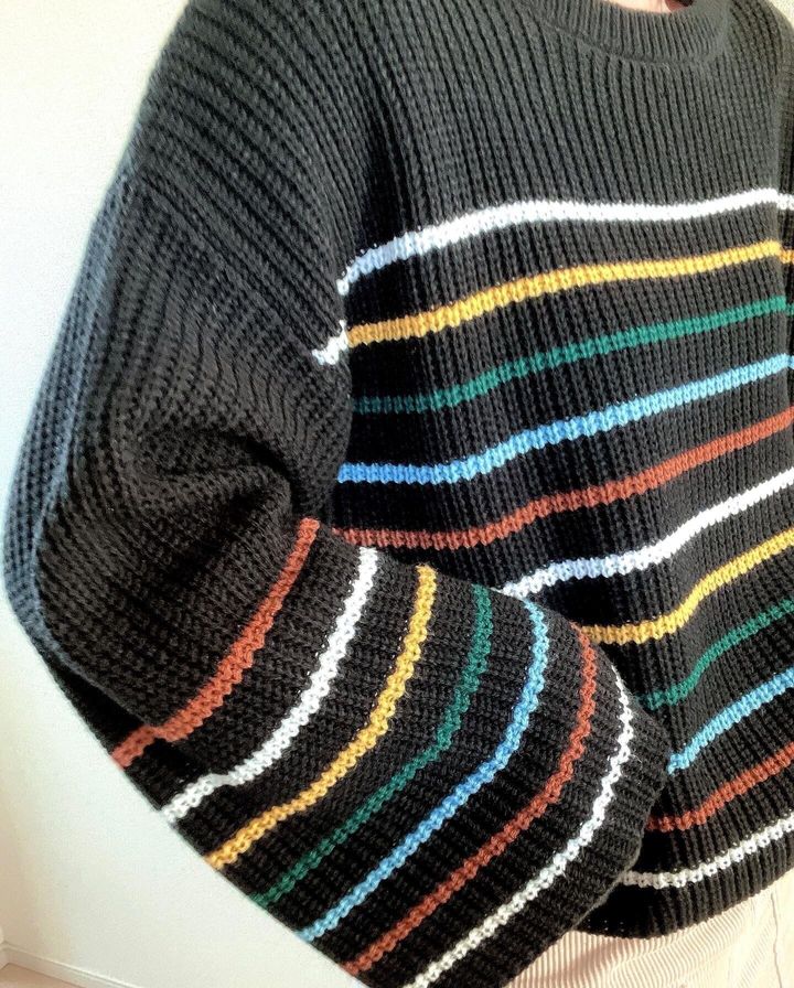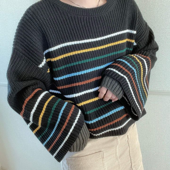 最近はカラー物が流行りでもあるので、ブラックベースのニットにカラーボーダーで主役級の可愛さです。