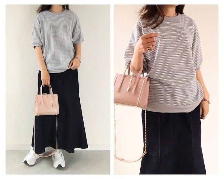 ジャガード編みの半袖トップスはグレー×ホワイトで透明感のある爽やかコーデに