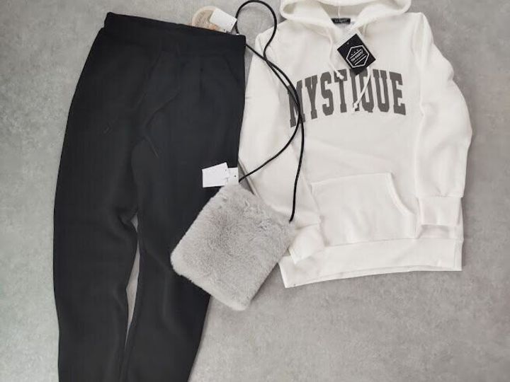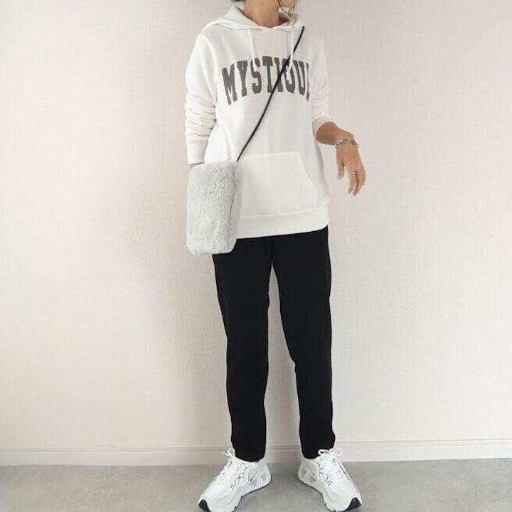スウェット上下で着るときはファーバッグやチェーンバッグ、アクセサリーを多めにつけるなど異素材のものを取り入れると部屋着感なくなりますよ