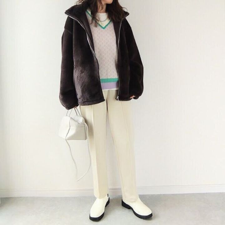 少しカラフルなベストはその中のカラーとボトムスのカラーを合わせれば統一感アップ!