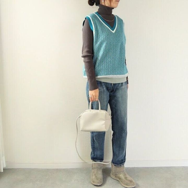 ブルーのベストは爽やかな海カラーなのでデニムとカラー合わせてより爽やかにしてみました