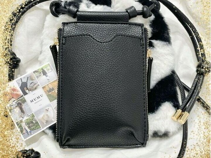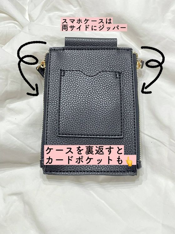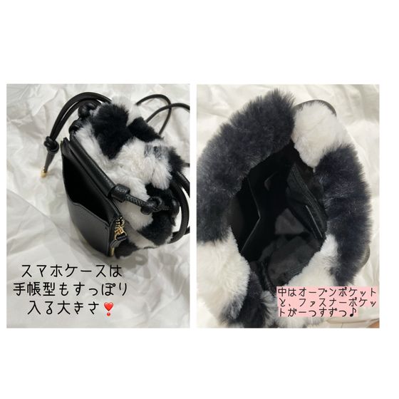 このファー巾着は外付けのスマホケースに、本体の巾着にも、オープンポケット、ファスナーポケットの2つがついているので、中身を分けやすいですよ。