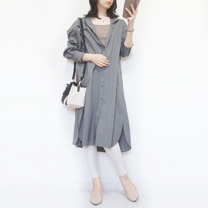 ニットタンクトップとレギンスの上からコットンギャザーロングシャツワンピースを着てみました。