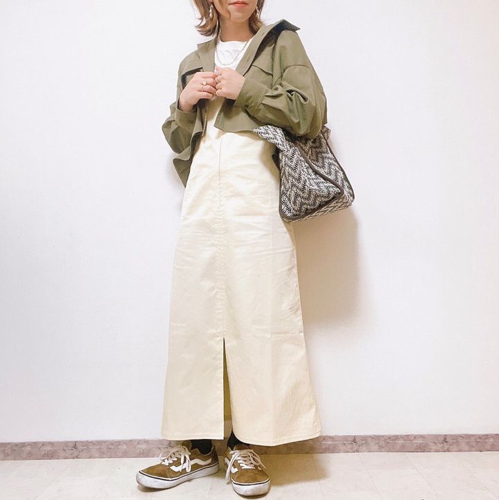 短丈のアウターを合わせるとスタイルアップ効果も。足元はスニーカーにしてカジュアルダウンしました。フロントスリットのおかげで足元に抜け感も出るので春のコーデにオススメです。