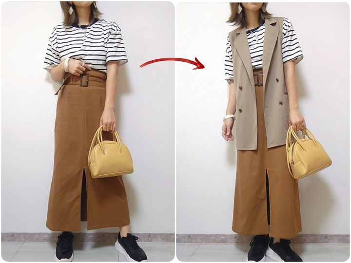 いつものボーダーTコーデもベストを羽織るだけで凝ったコーディネートへ。