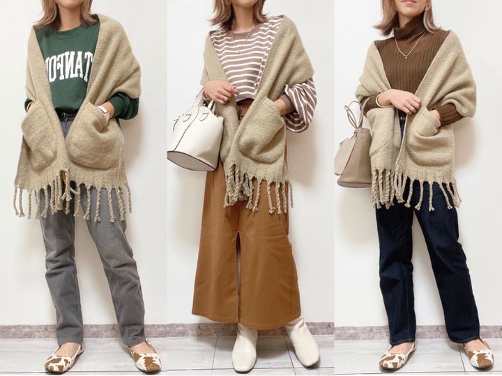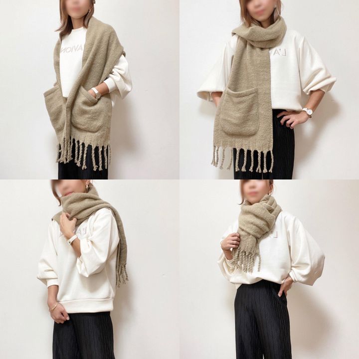 画像左上は、てらさんもご紹介されてた羽織る方法。カーディガンのようにサッと羽織れるので少し外に出る場合や、寒い室内でも重宝しそうです。