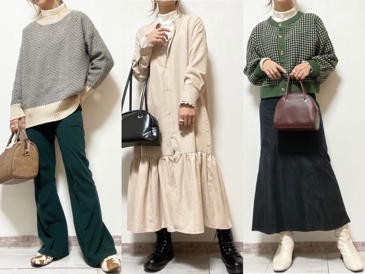 写真中央:ロングのティアードシャツワンピのインナーとして着用してみました。首元が温かく、こなれ感が出るコーデに。首元や胸元が空いたワンピースと合わせるのがおすすめです。