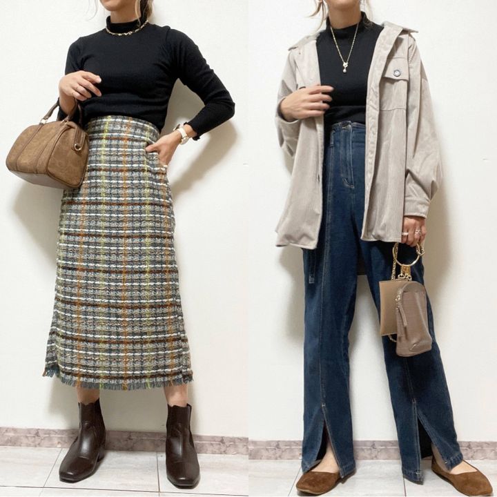 写真左:レイヤードせずにそのままツイードのスカートと合わせてみました。ブラックは他のカラーを引き立てる為、カラーものと合わせるのが好きです。ハイネックとツイードの組み合わせでコンサバっぽい雰囲気が出ます。