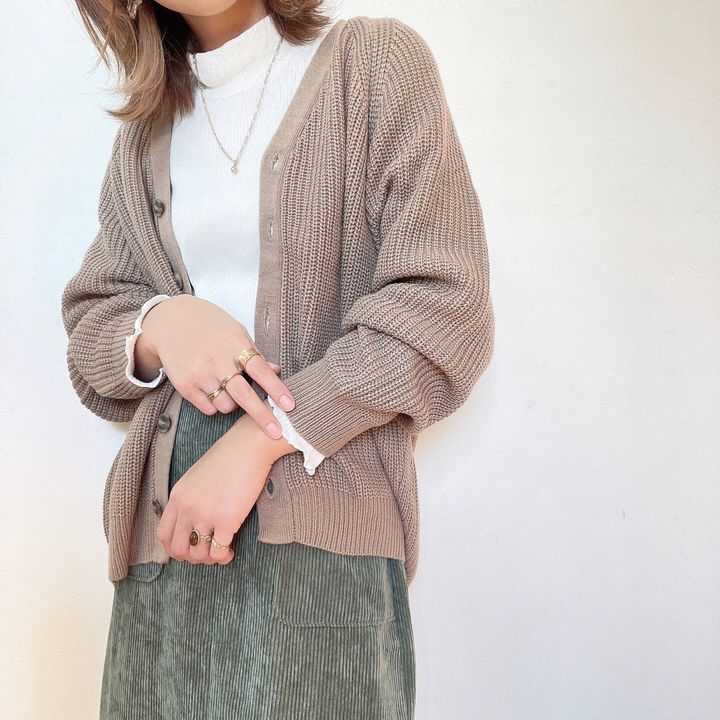 写真右:上からグリーンのカーディガンを着てみました。前ボタンを閉めて着ても首元のハイネックがアクセントになってお洒落な印象に。ブーツも同色のホワイトをチョイスしました。
