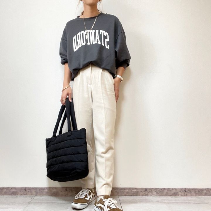 今季も人気のカレッジロゴのスウェットと合わせてカジュアルスタイルに。たっぽりとしたスウェットとテーパードパンツは相性がよく、おすすめの組み合わせです。